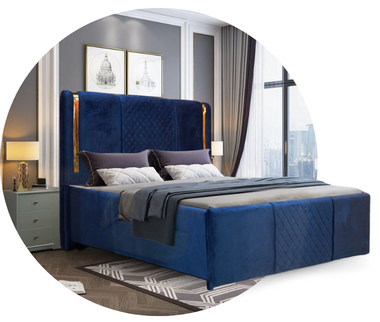 Maria Upholstered Bed with dual headboard - BlueTransform your bedroom into a luxurious and functional space with the Maria Upholstered Bed. Condition: Brand New Colour: Velvet fabric in Beige Color (Customisable) Frame: Solid Wood (Meranti Wood) & PlyWood; SS Metal Strips Foam: Springwell 32 density Dimensions : King: 75.5(W) X 82(D) X 55(H) inches, Queen:...